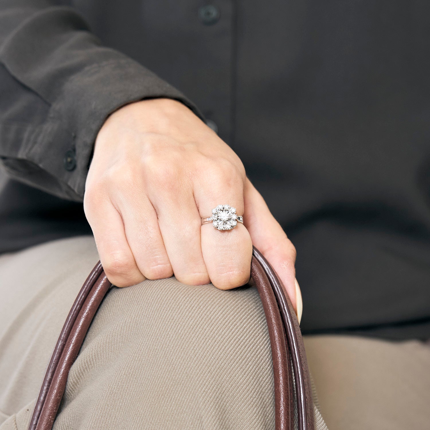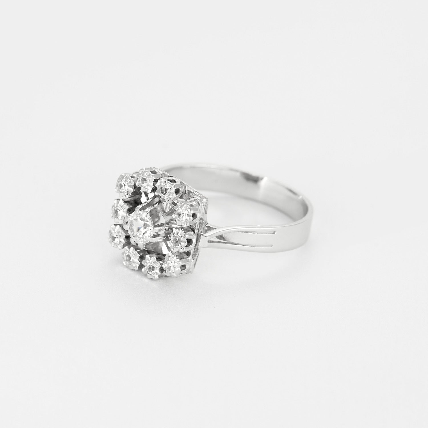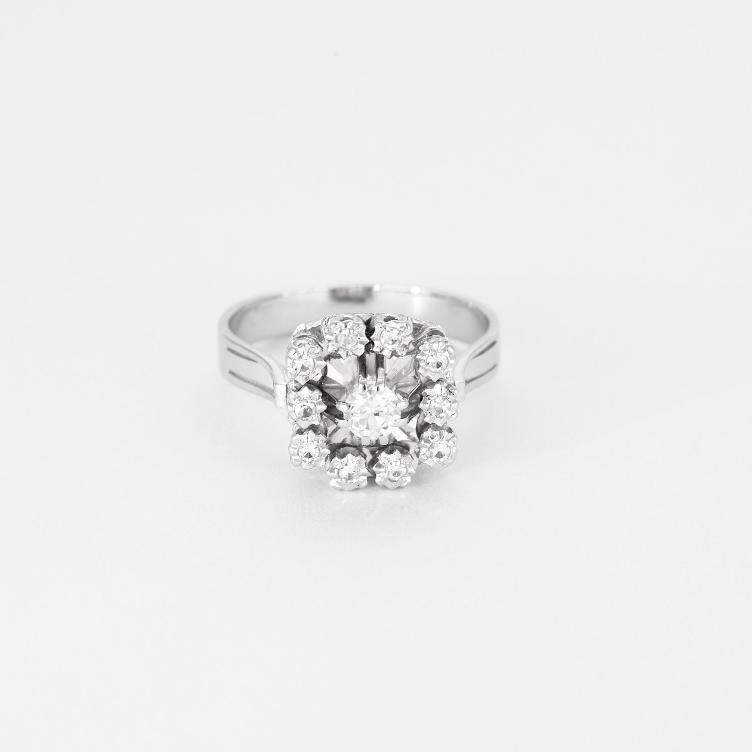 Bague ancienne en or blanc 18 carats, représentant un motif carré, sertie de 10 diamants autour d'un diamant plus gros d'environ 0,15 carat (3,5mm)