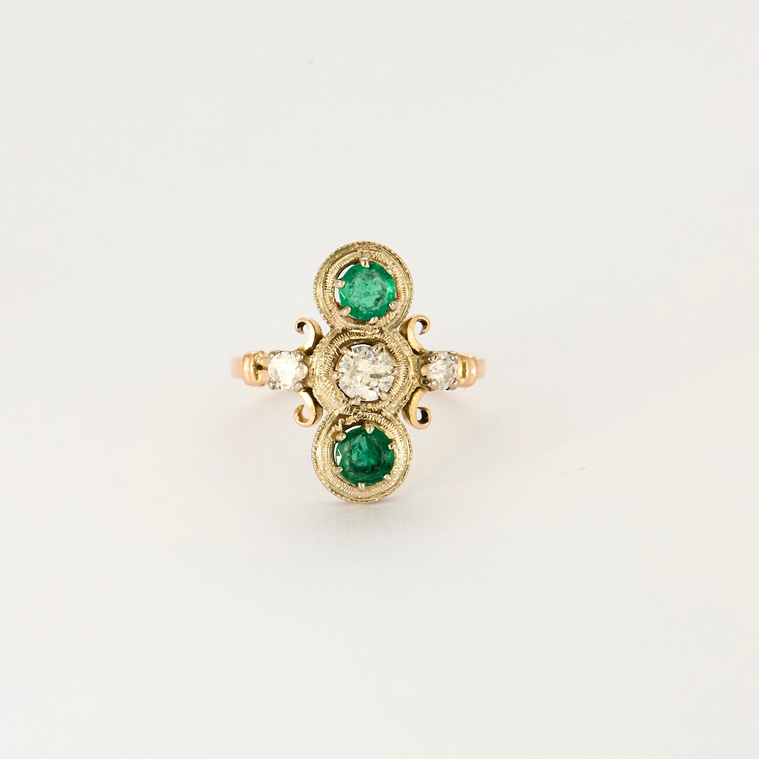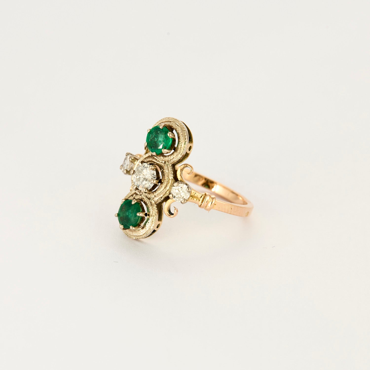 Très jolie bague "antique" en or rose et or blanc ciselé 18 carats, sertie d'un diamant au centre de 4mm, de 2 émeraudes de 4,2mm et de 2 plus petits diamants sur les côtés.