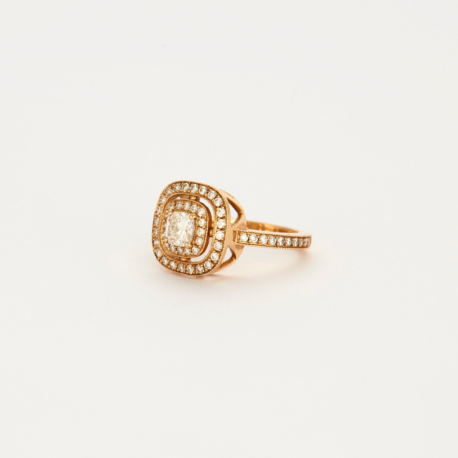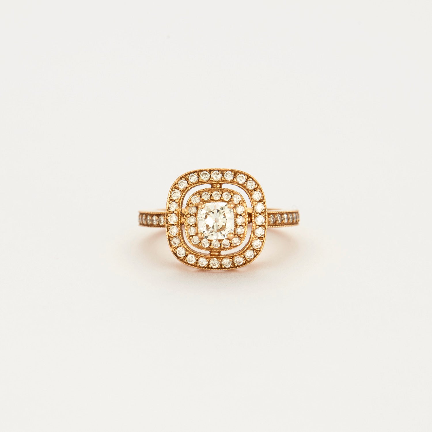 Bague dans un style "art deco" en or rose 18 carats, sertie d'un diamant coussin d'environ 0,49 carat et de 60 diamants tailles brillants.