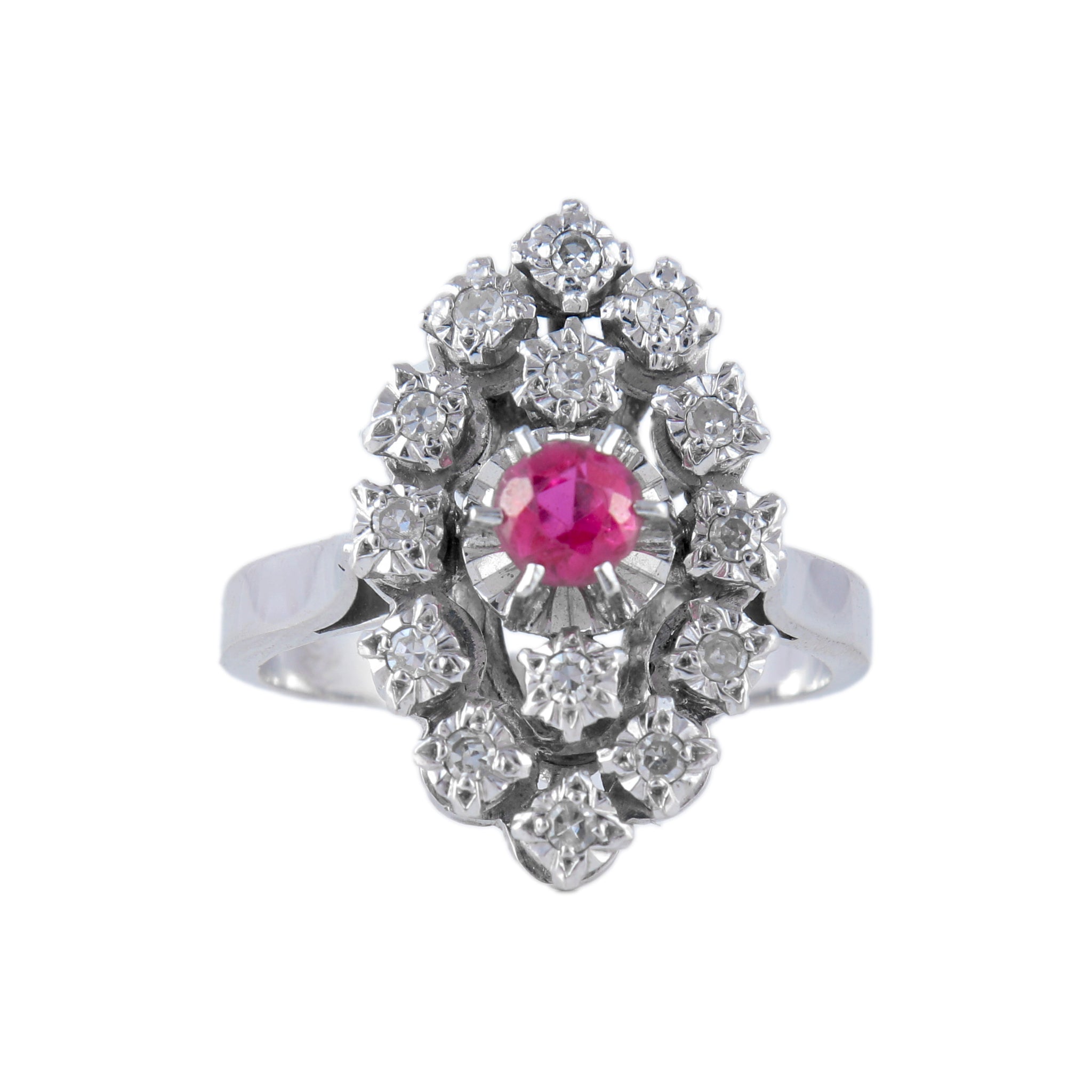 Bague marquise en or blanc 18 carats, sertie de 14 diamants et d'une pierre rose (très probablement rubis).