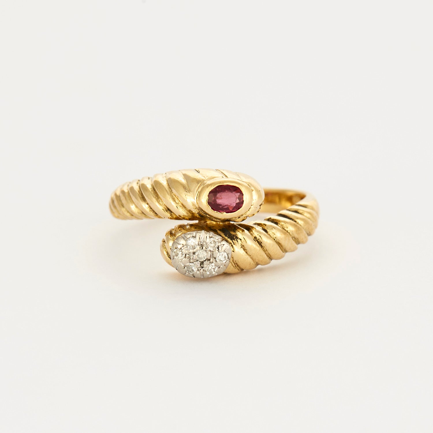 Bague Toi & Moi en or jaune 18 carats sertie d'un petit rubis et de diamants.