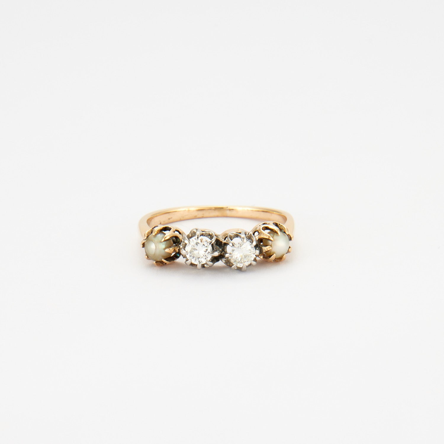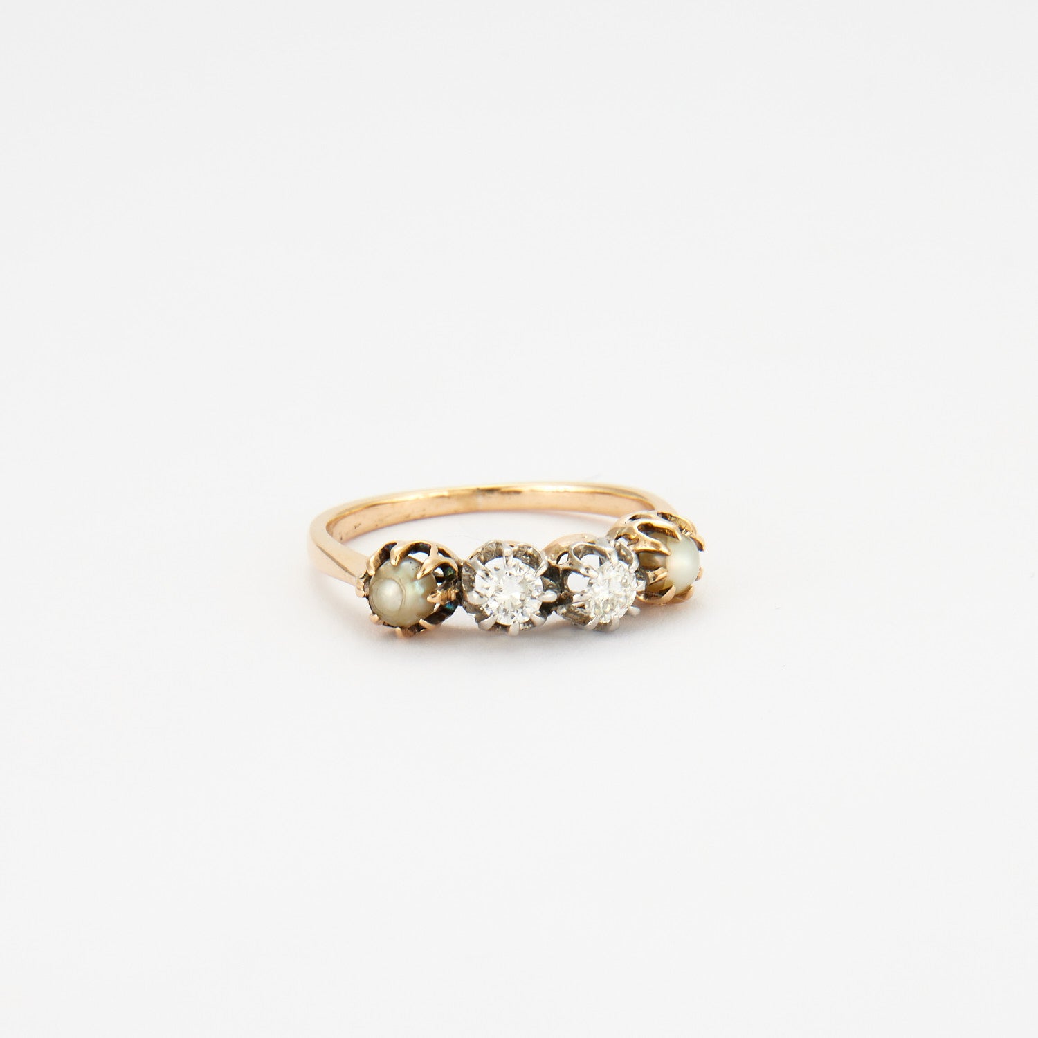 Bague en or jaune 18 carats et platine, sertie 2 diamants tailles anciennes et de 2 perles.