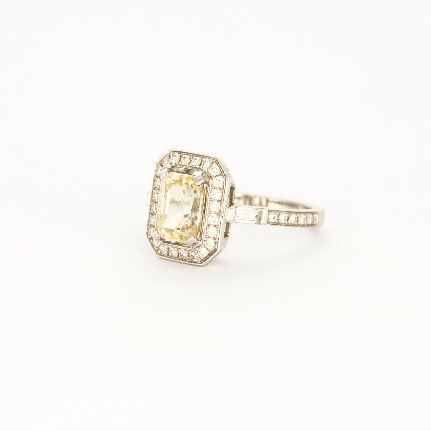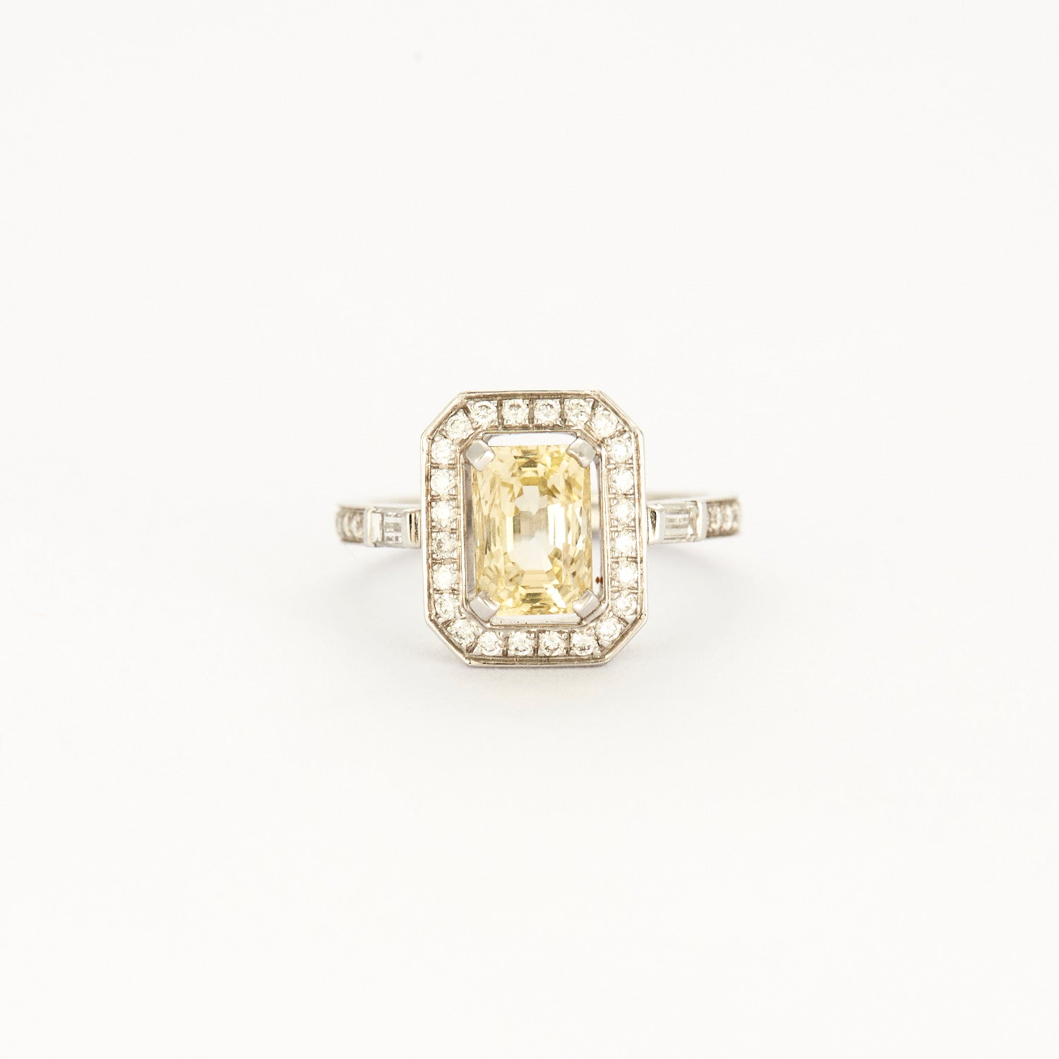 Bague dans un style solitaire art deco, en or blanc 18 carats, sertie de 36 diamants tailles brillants, de 2 diamants baguettes et d'un saphir jaune de 2,53 carats (certifié naturel et non chauffé, provenance d'Afrique de l'Est 7,88 x 5,52 x 5,05)