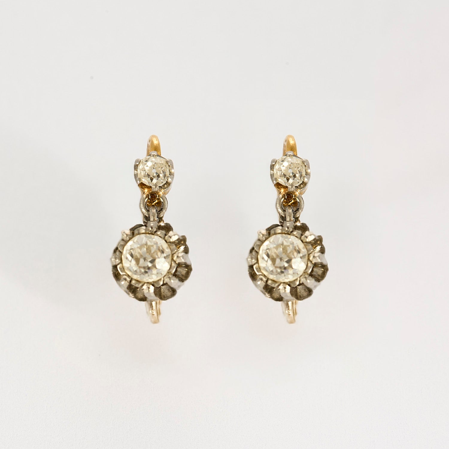Très jolie paire de boucles d'oreilles "dormeuses", en or jaune 18 carats et platine, sertie de 4 diamants tailles anciennes. Les plus gros font environ 0,30 carat chacun.