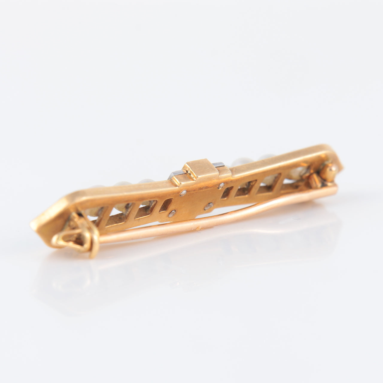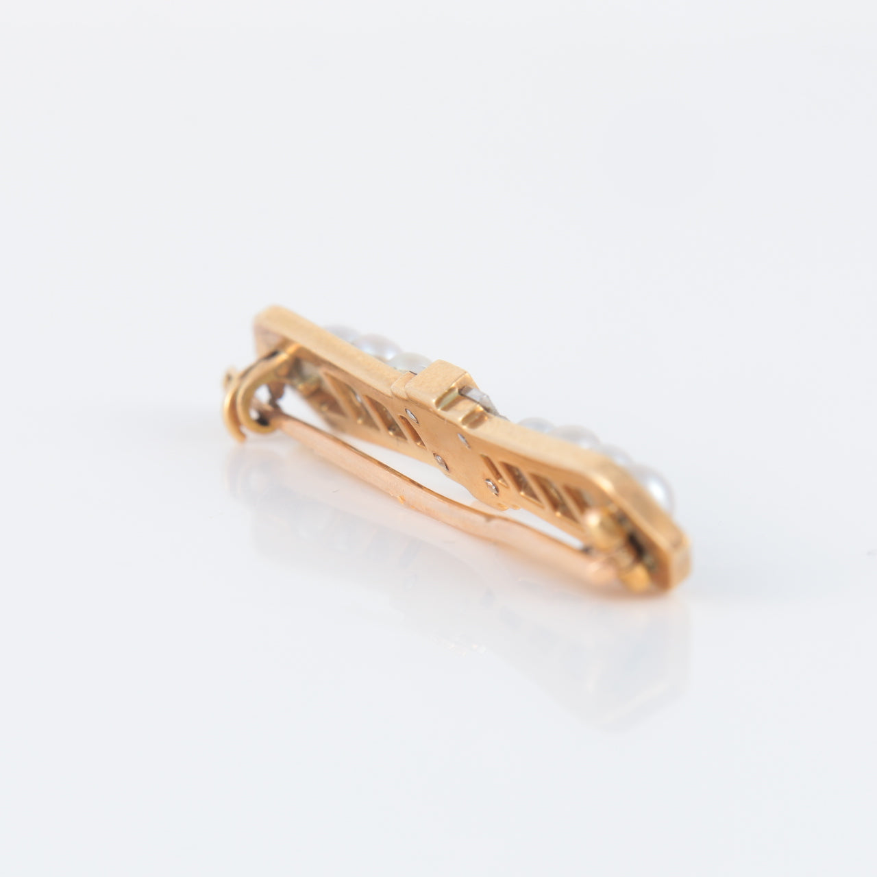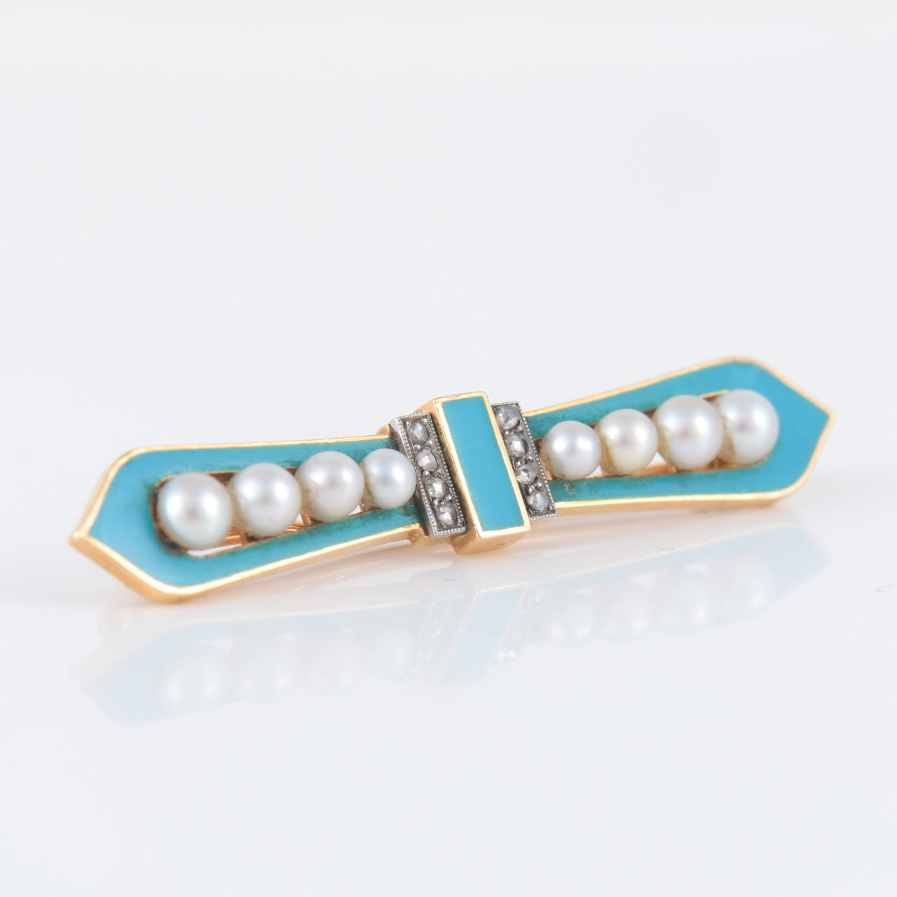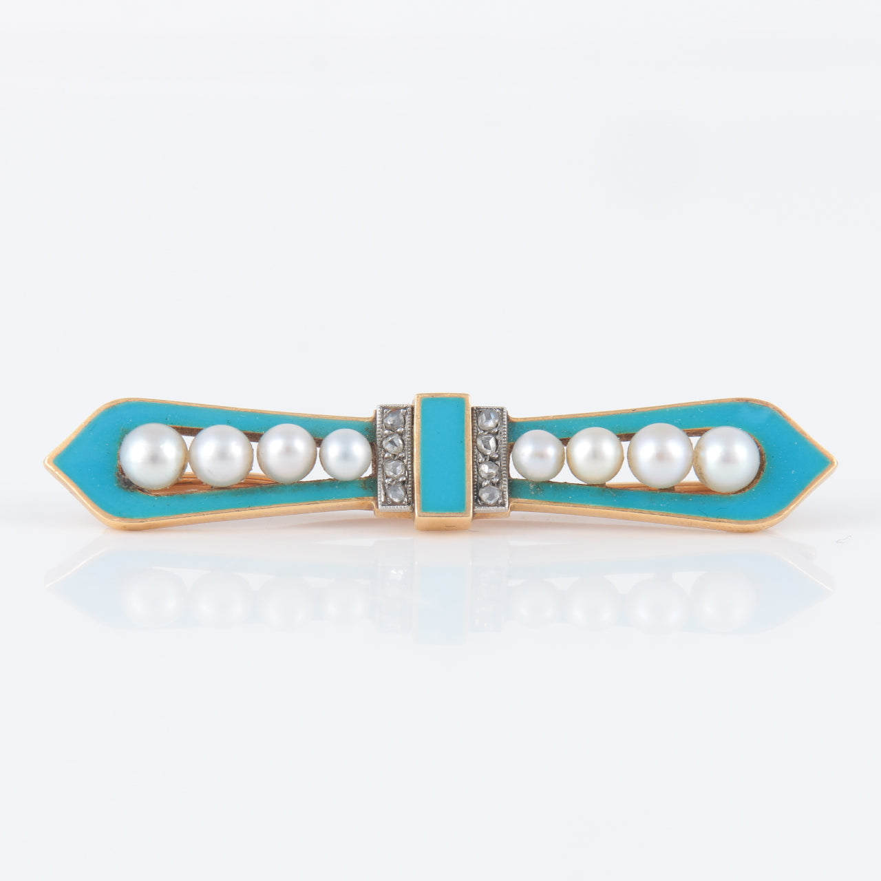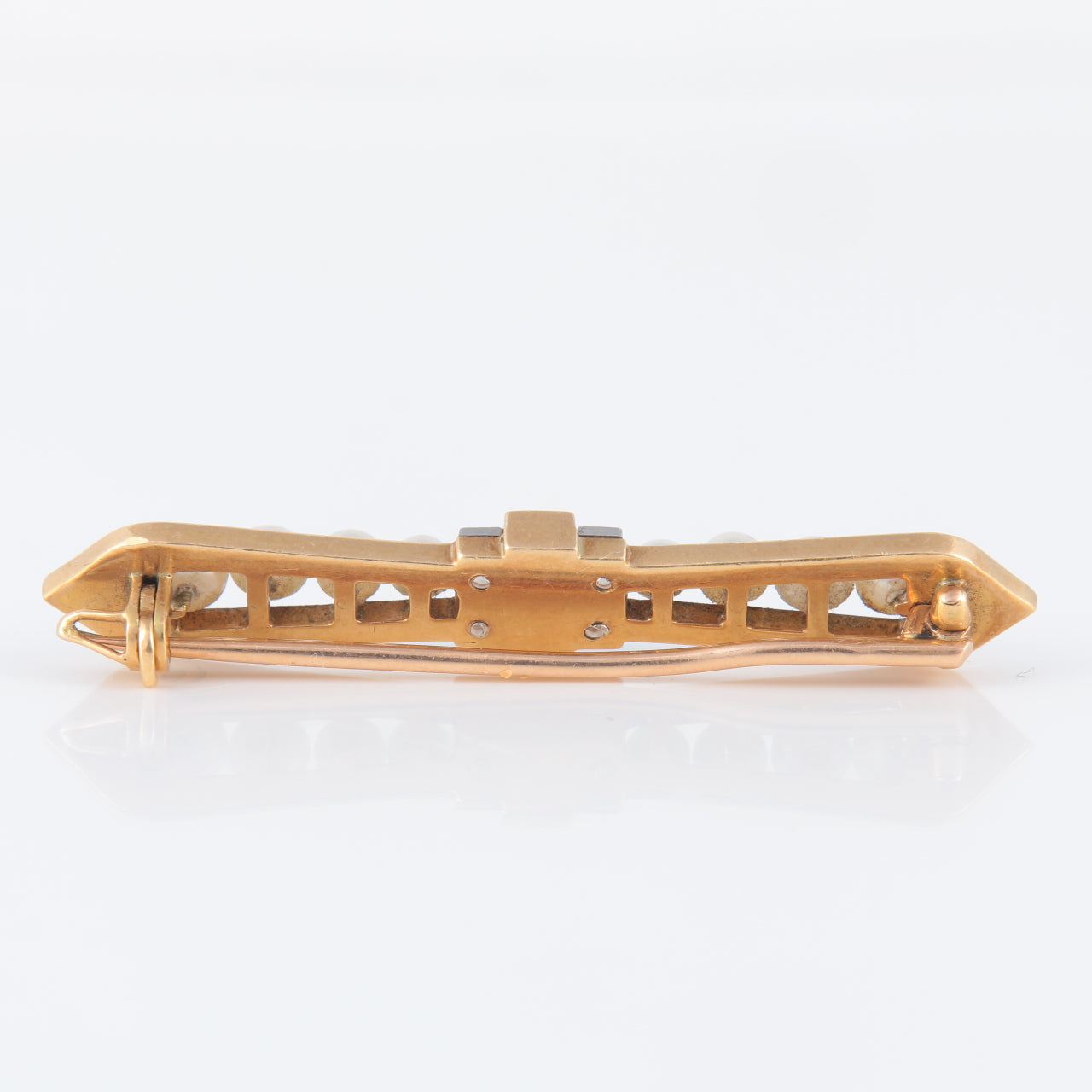 Superbe broche Art Déco, en or jaune 18 carats, avec 8 perles blanches, 8 diamants taille ancienne, et de la turquoise.
