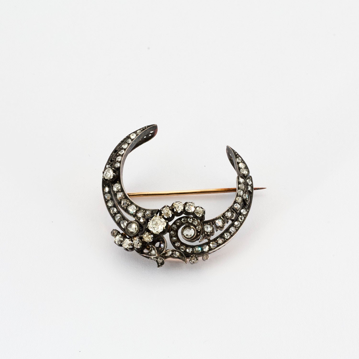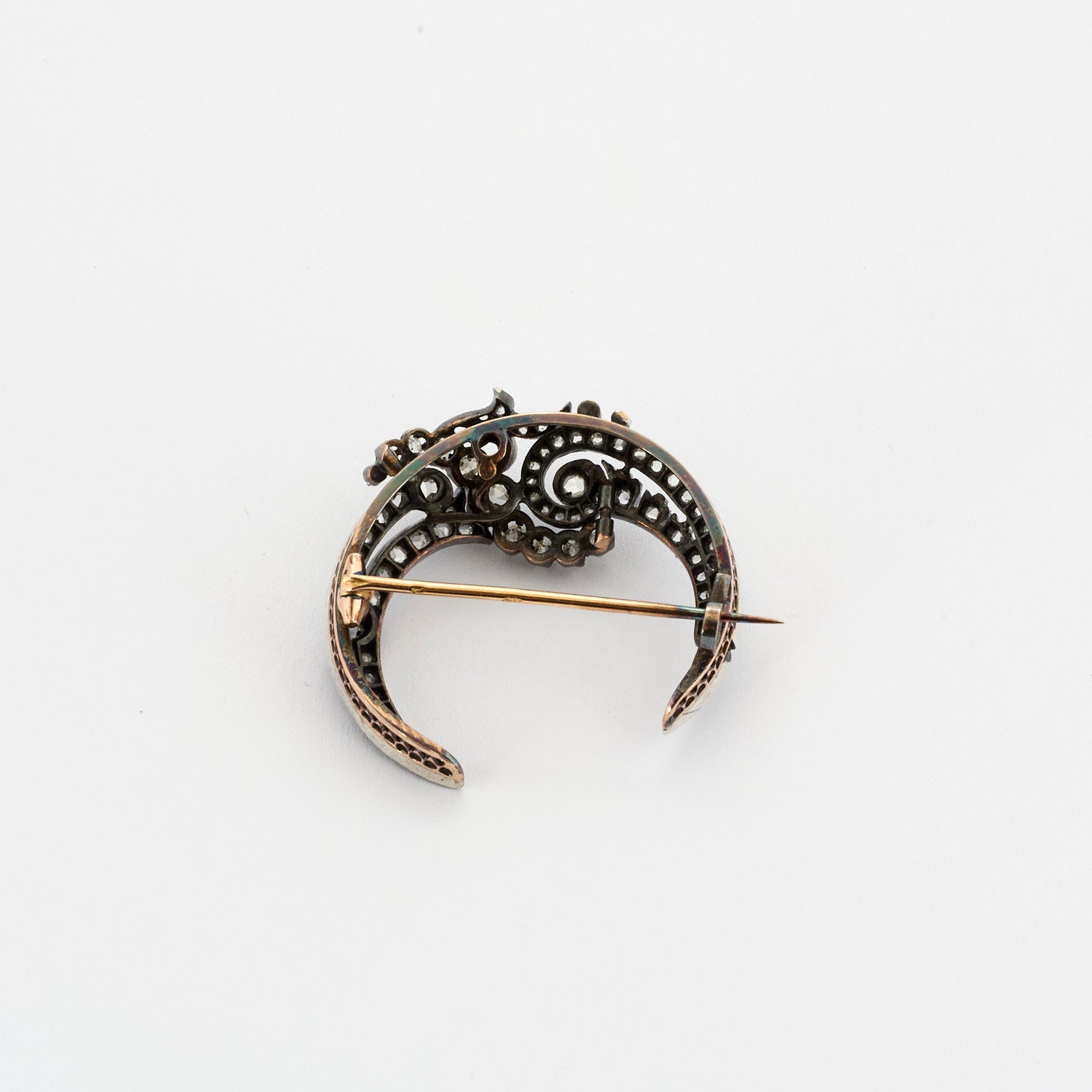Sublime Broche "croissant de lune" époque Napoleon III (XIXe siècle) en or rose 18 carats et argent sertie de diamants tailles roses et tailles anciennes. Diamant central environ 0,20 carat.