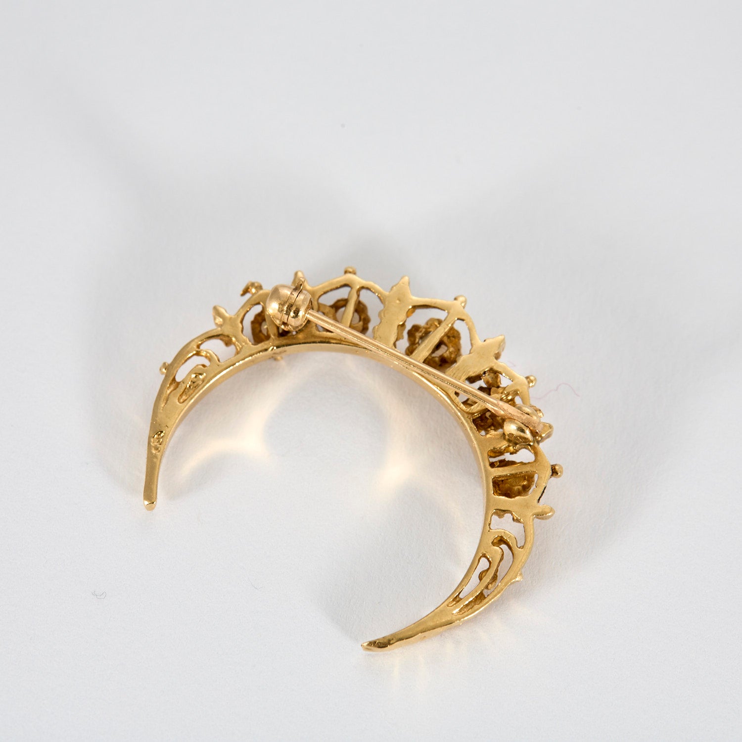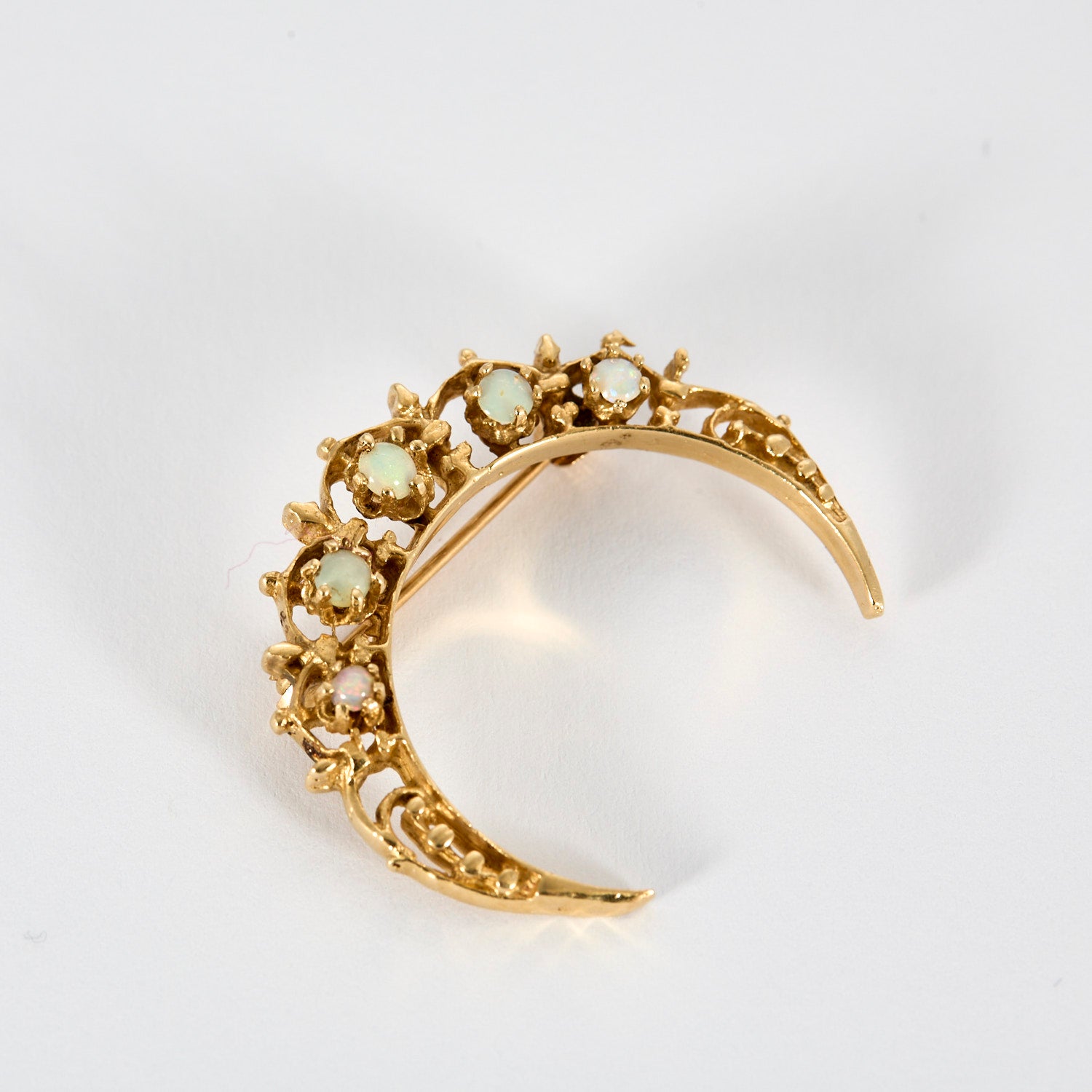 Très jolie broche ancienne "Lune", en or 14 carats et sertie de 5 petites opales en cabochons.