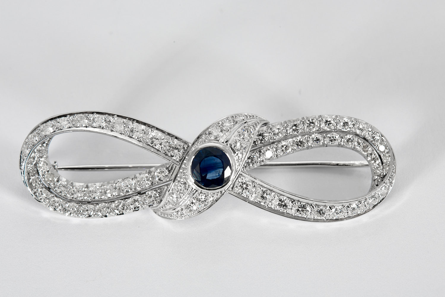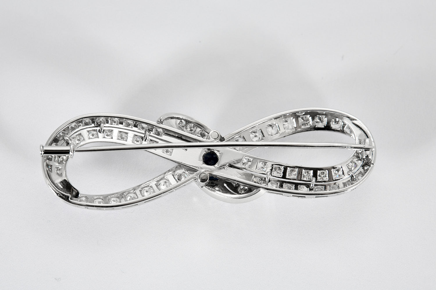 Sublime broche ancienne motif "infini" en platine sertie de 72 diamants et avec un Saphir bleu intense central de 1,33 carat.