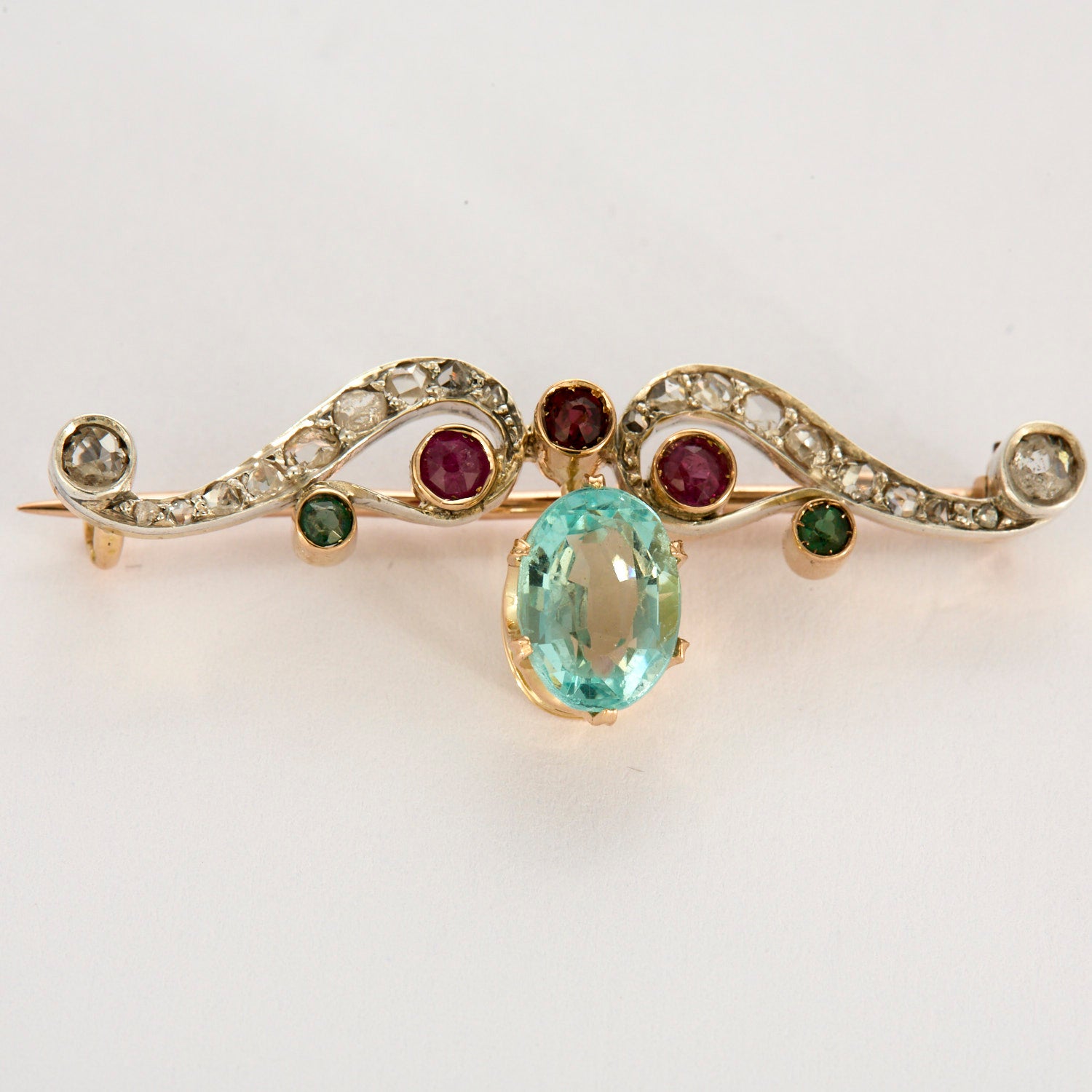 Sublime broche fin XIX en or et platine, sertie de 20 diamants tailles roses, de 3 rubis, de 2 émeraudes et d'une incroyable pierre bleue turquoise (probablement une Tourmaline Paraiba)