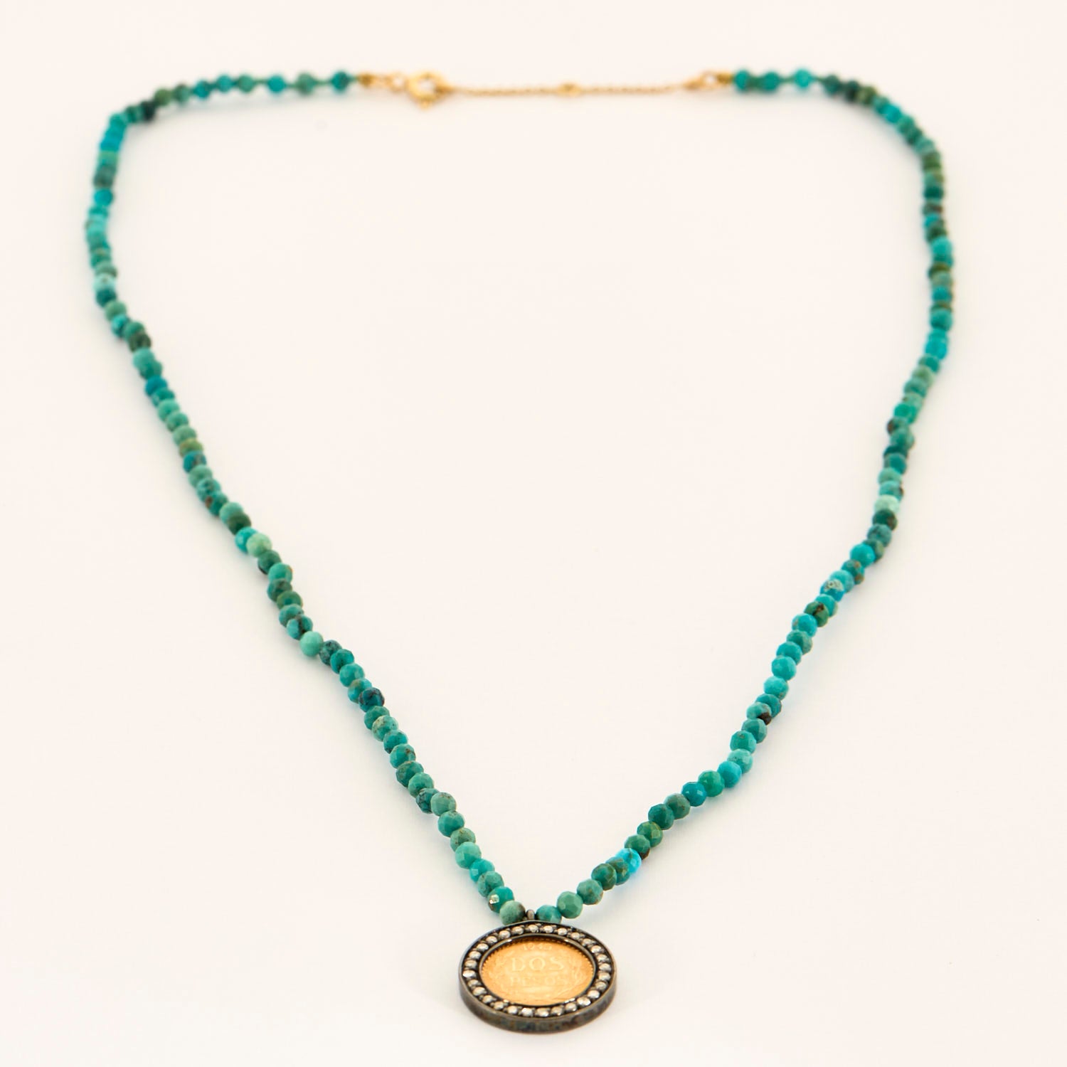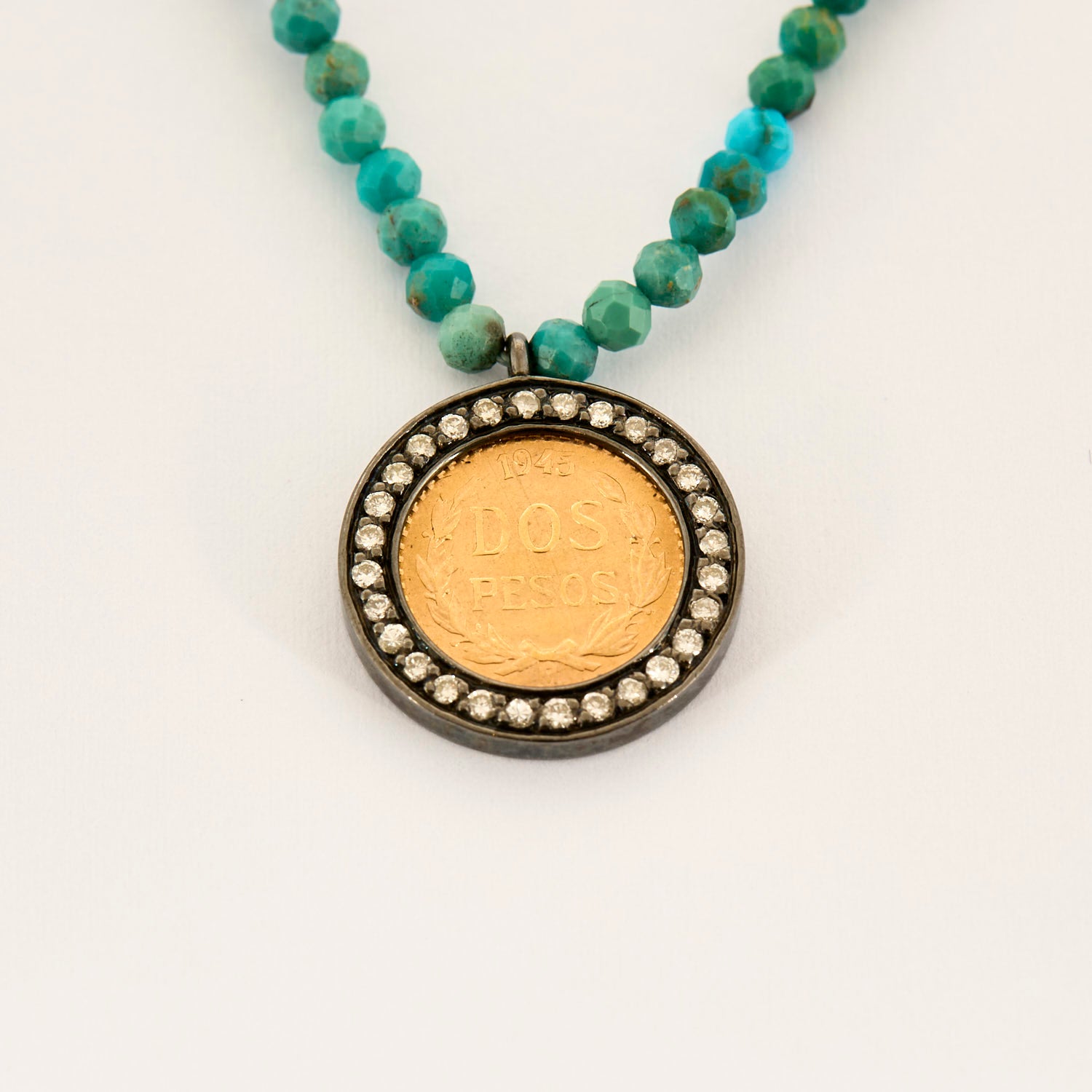 Collier en turquoises, avec pendentif en argent noirci renfermant une pièce en or de 2 Pesos et serti autour de diamants naturels. Attache à l'arrière en or jaune 18 carats, possibilité 3 longueurs.